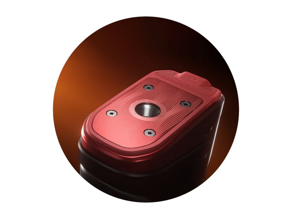 Horní velká platforma zdobená texturovaným designem je osazena vnitřním závitem typu 510. Tento typ závitu zajišťuje snadnou a bezproblémovou kompatibilitu modu s drtivou většinou dnešních atomizérů na tovární žhavící hlavy. Pokud však toužíte po dokonalém přizpůsobení, můžete sáhnout po některém z DIY atomizérů, které umožňují připojení vlastní spirálky.