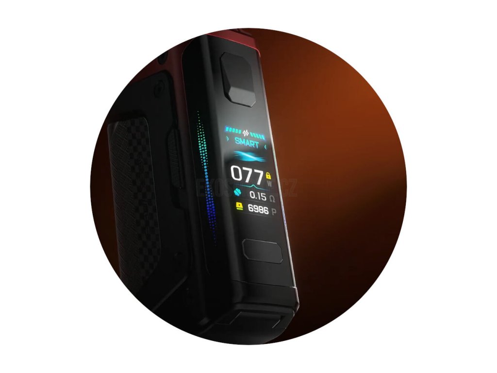 Velký barevný displej s úhlopříčkou 1,08" a technologií TFT zobrazuje v reálném čase veškeré důležité informace o zvoleném režimu, výkonu, stavu baterie a naměřeném odporu. Nechybí ani počítadlo potahů. Po stranách je displej doplněný o ambientní LED osvětlení. V rámci individualizace si můžete vybírat z pěti světelných efektů.