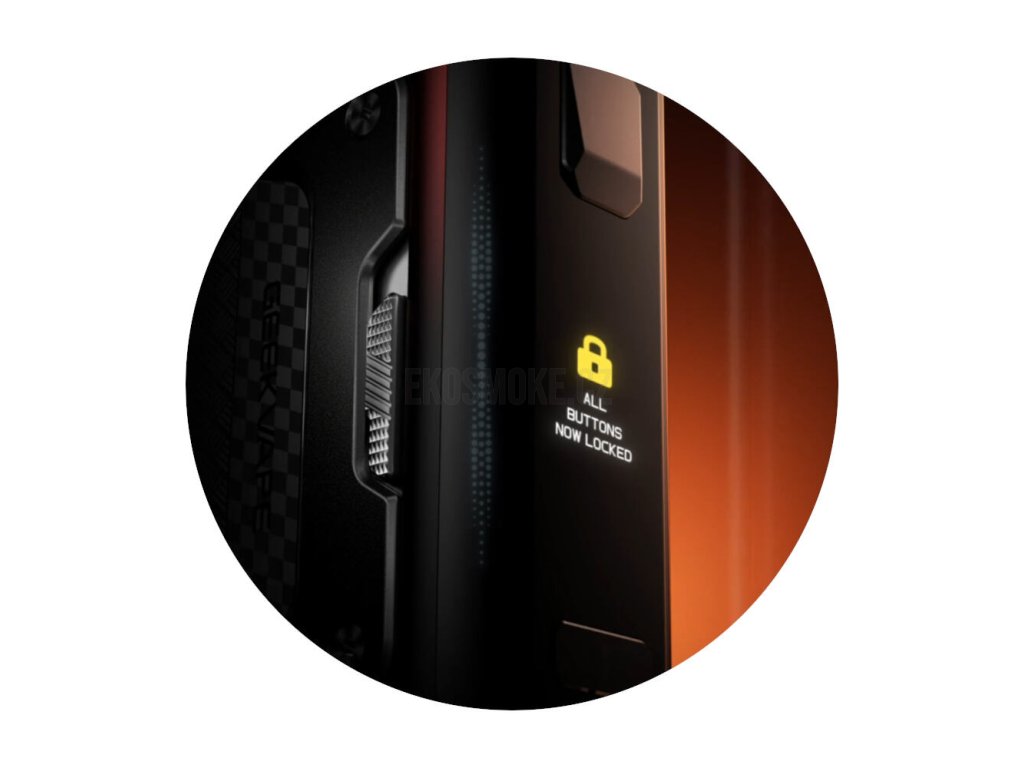 Jednoduchý mechanický posuvník A-Lock slouží jako rychlá a efektivní ochrana před náhodným spuštěním žhavení nebo přenastavení hodnot, když jej přenášíte například v kapse. Zároveň funguje jako bezpečnostní pojistka proti odemčení modu dětmi. Díky zdrsněnému povrchu a strategickému umístění v boční části modu je možná pohotová aktivace a deaktivace jednou rukou.
