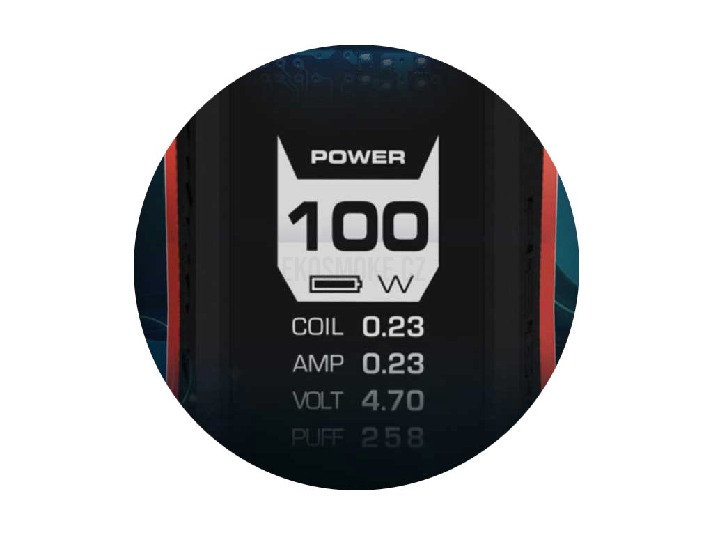 OLED displej Všechny nastavené parametry se zobrazují na přehledném a dostatečně velkém OLED displeji, který spolu se spínacím a funkčním tlačítkem dominuje čelní straně modu. |