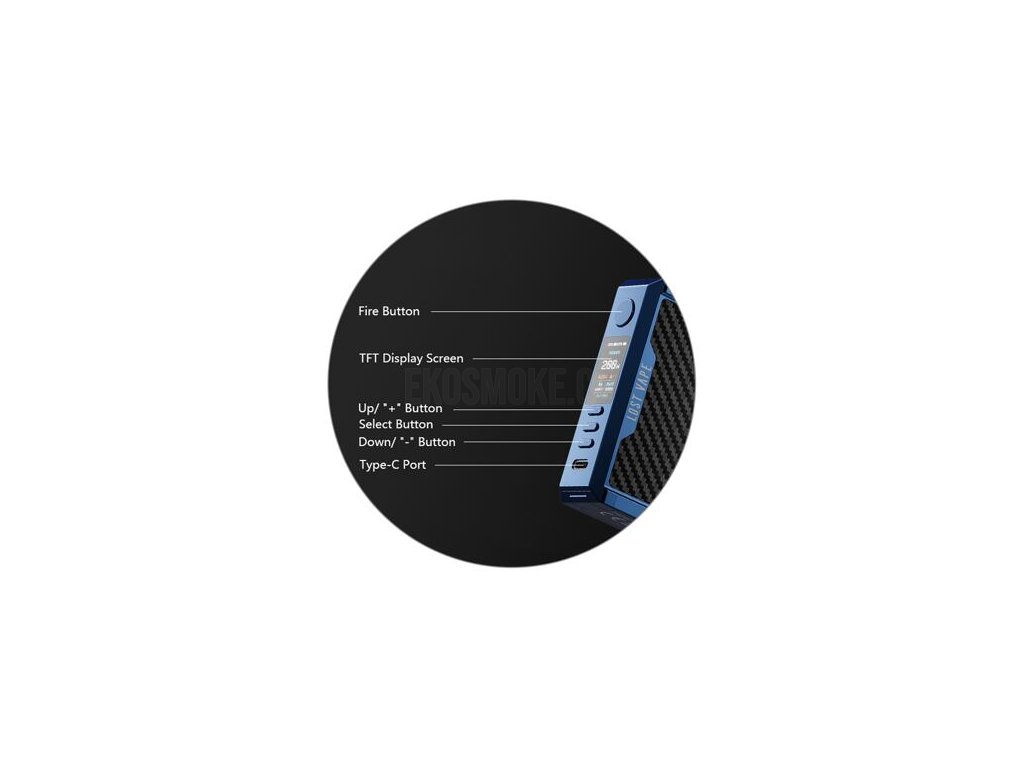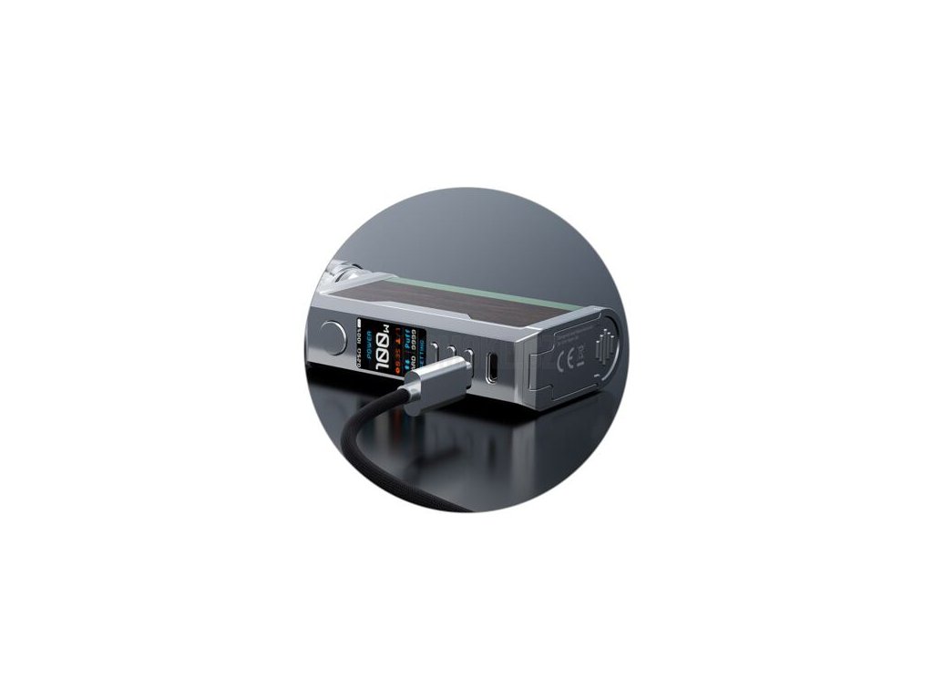 Ve spodní části modu se nachází praktický kryt pro baterie. Mod pracuje se dvěma externími bateriemi typu 18650, které zajistí hladký chod a nekompromisní výkon. Vaše vlastní baterie si poté budete moci kdykoliv pohodlně dobíjet přímo v modu, na předním panelu se nachází rychlý port USB-C pro dobíjení baterií proudem až 1,8 A.