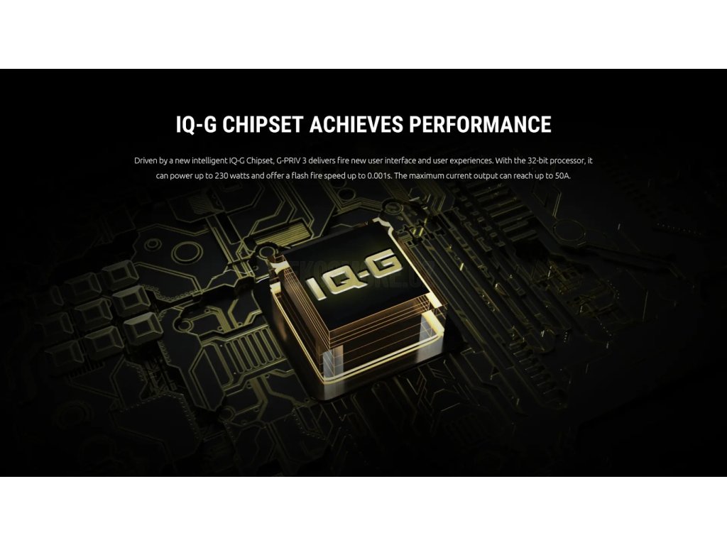 Propracovaný Chipset IQ-G Zařízení si můžete také zabezpečit pomocí hesla, například proti nechtěnému použití dětmi, či jinou osobou. Veškerá tato nastavení i samotný výkon řídí moderní IQ-G chipset, který zároveň nabízí celou řadu ochranných mechanismů, jakými jsou například ochrana proti zkratu, automatická deaktivace žhavení při nechtěném dlouhém stisku 10 sec., inteligentní rozpoznání použitého odporu atomizéru, ochranu proti přehřátí aj.