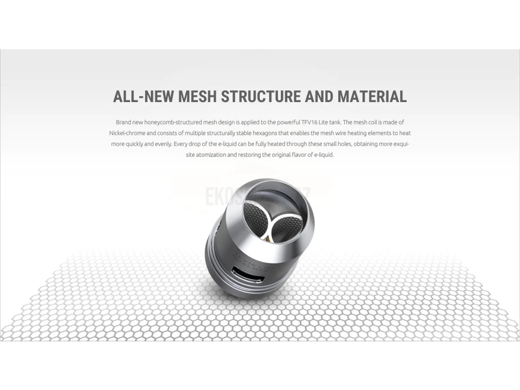 V tomto setu naleznete hned dvě TFV16 žhavící hlavy. Obě jsou vybaveny mesh spirálou, kdy jedna je s odporem 0,2Ω a jednu mesh spirálu, druhá je s odporem 0,15Ω a je vybavena hned dvěmi mesh spirálami. Obě tyto žhavící hlavy jsou primárně určeny k příméhu potahování do plid (DL).