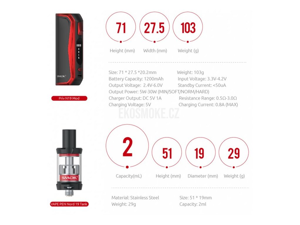 Priv N19 je nejnovějším a nejpropracovanějším přírůstkem této oblíbené řady gripů od Smoktechu. Vestavěná baterie o kapacitě 1200mAh je vybavena přehledným LED indikátorem stavu nabití. Grip nabízí čtyři možnosti nastavění výkonu až do 30W, a to MIN/SOFT/NORM a HARD. Mezi jeho další přednosti patří ochrana proti zkratu a přehřátí nebo osmi vteřinová ochrana žhavení. Clearomizer Nord 19 je osazen žhavicími hlavami Nord, které se osvědčili ve stejnojmenné e-cigaretě. Odpor 1,4ohm je pak ideální kompromis k produkci páry a skvělému podání chuti. Náustek je pevnou součástí vrchní krytky clearomizeru, po jehož odšroubování lze jednoduše doplnit až 2ml liquidu. Tank lze pak regulovat spodním přívodem vzduchu.