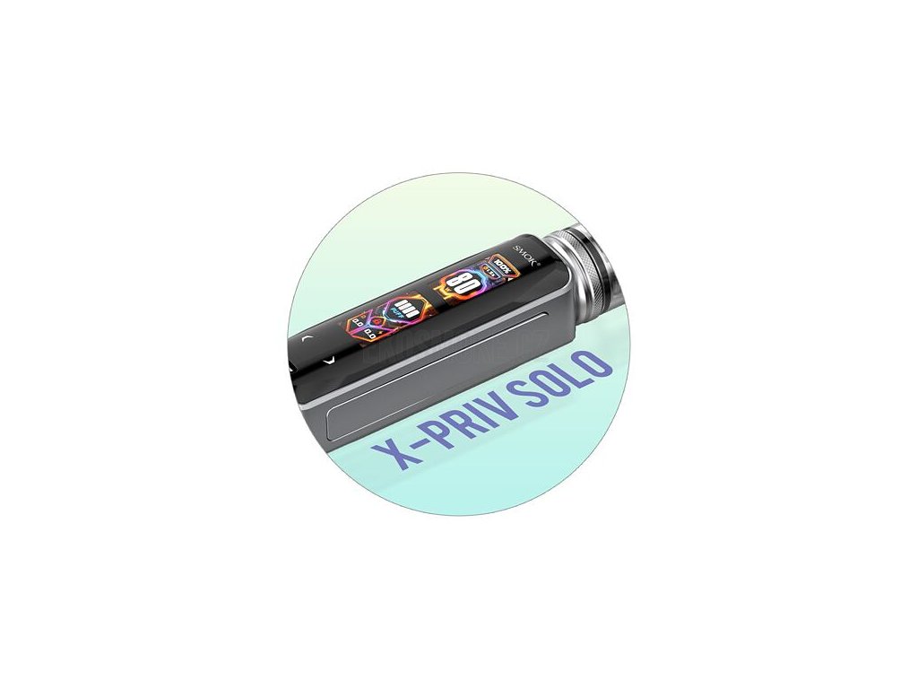 SMOK X-Priv Solo Mod je menším sourozencem dvoubaterkového giganta SMOK X-Priv Plus. Geniálně navržený box mod se slotem pro jednu baterii typu 18650 a výstupním výkonem až 80 W nabídne moderní uživatelské rozhraní, snadnou obsluhu, praktická dotyková tlačítka a obrovský barevný duální displej. Komfortní stisk v dlani zajistí ergonomicky zpracovaná konstrukce s rozměry 89.5 x 28 x 27.65 mm a obrovské spínací tlačítko v boční části modu. Samozřejmostí je tradiční závit typu 510 v horní části, pomocí kterého si můžete mod osadit libovolným vlastním atomizérem s tímto typem uchycení. Možnosti využití jsou tak skutečně nekončící a používání modu Vás rozhodně neomrzí.