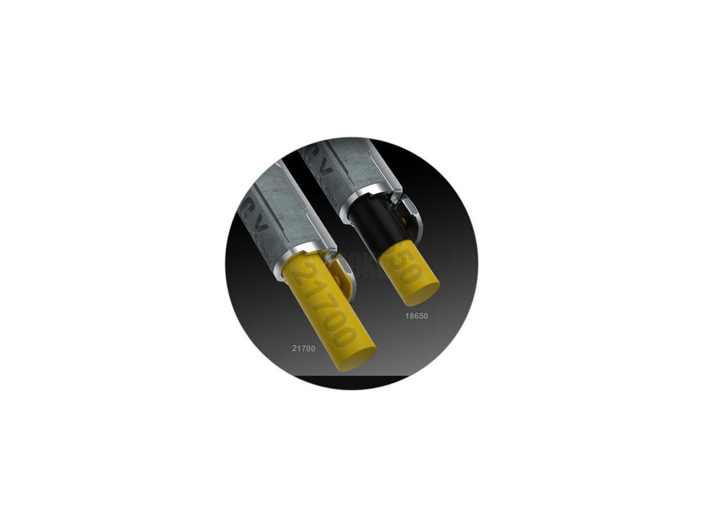 | Slot pro baterii 21700 Uvnitř těla modu se nachází slot pro velkou baterii typu 21700. Můžete rovněž použít také baterii 18650 s adaptérem, který se nachází v balení. Díky slotu pro externí baterii se můžete těšit na vysoký výstupní výkon dosahující až 100 W. Nesmí chybět celá řada bezpečnostních ochran. Baterii si můžete navíc pohodlně dobíjet přímo v modu díky přítomnosti USB-C portu na těle. |
