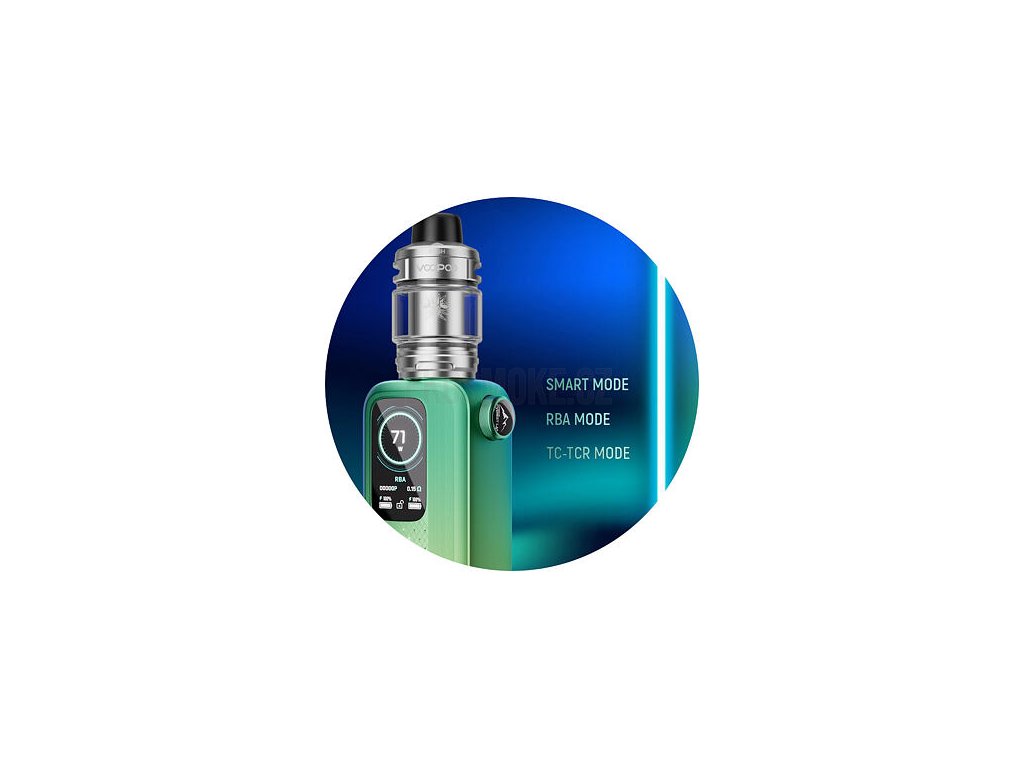 Upgradovaná verze integrovaného čipsetu umožňuje výběr hned ze tří režimů vapování. V režimu Smart s automatickou detekcí odporu žhavící hlavy elektronika sama zvolí optimální nastavení a omezí maximální výkon pro daný typ tělíska. Ovládání modu je tak dostatečně jednoduché i pro méně zkušené vapery. RBA režim nabízí zcela variabilní nastavení výkonu od 5 do 220 W po 1 W, díky čemuž můžete experimentovat s výslednou chutí a množstvím páry. Poslední režim TC-TCR je určen pro vyznavače DIY vapingu a umožňuje regulaci podle teploty se čtyřmi přednastavenými typy vodičů - SS316, SS430, Ni200 a Titanium.