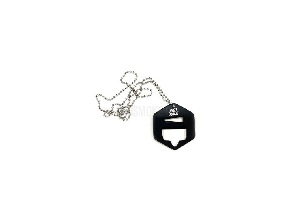 Nástroj s logem Just Juice dokáže otevřít všechny běžně dostupné lahvičky o objemu 10ml, 30ml, 50ml, 60ml a 120ml. Součástí balení je praktický řetízek pro zavěšení na krk.