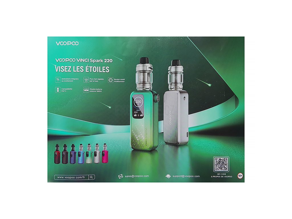 Reklamní plakát ve formátu A5 propagující elektronickou cigaretu VooPoo Vinci Spark 220 s francouzským sloganem "Visez les étoiles" (Mířit ke hvězdám). Plakát zobrazuje dvě barevné varianty zařízení - tyrkysově zelenou a stříbrnou - spolu s přehledem všech dostupných barevných verzí a klíčových vlastností produktu. Kvalitní tisk s atraktivním designem v zelených tónech ideální pro prodejny, vapeshopy nebo jako informační materiál pro zákazníky. Plakát obsahuje oficiální grafiku značky VooPoo včetně QR kódu a kontaktních údajů.