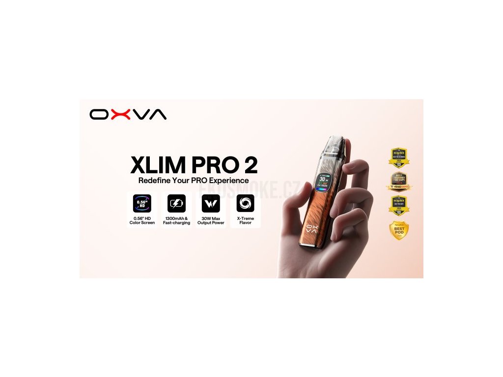 Elektronická cigareta OXVA Xlim Pro byla vyhlášena nejoblíbenějším POD zařízením mezi vapery za období 2023 a 2024. Nyní přichází výrobce s druhou řadou, která si pro Vás přichystala mnoho novinek. Elegantní a čistý designe těla baterie zdobí 0,56 palcový barevný Ultra-HD displej, který poskytuje vynikající přehled o nastavení všech hodnot. Vestavěný monočlánek nabízí vyšší kapacitu baterie 1300mAh, USB-C port s 2A nabíjením a výkonem až 30W. Na boční straně baterie je umístěno regulační tlačítko pro přívod vzduchu, díky kterému si jednoduše nastavíte RDL nebo MTL režim vapování. V obsahu balení najdete cartridge Xlim V3 s horním plněním - není potřeba vyndavat cartridge z těla baterie při plnění liquidem. Cartridge V3 jsou plně kompatibilní s verzí V2.