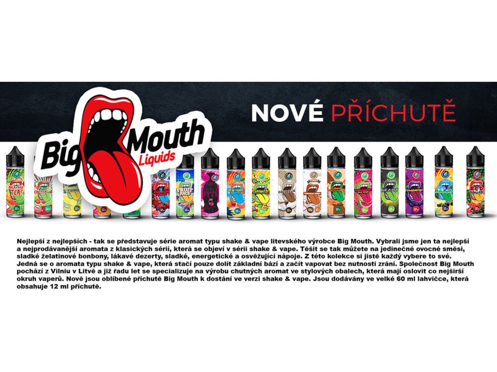 Big Mouth nabízí obrovský výběr a lákavé kombinace. Big Mouth znají téměř všichni. Big Mouth začínal na několika málo příchutích, ale nyní jich má více než stovku. Nabídka Big Mouth nabízí ovocné, dortové, nápojové a další příchutě. Big Mouth má vše, na co si vzpomenete. Big Mouth dodává v krabičce navíc, kromě příchutě, také 30ml lahvičku.